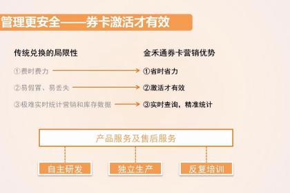 1、金禾通提供两种券卡:实体券和电子券,全渠道销售(线上线下无障碍销售),放心对接任意资源,销售2、快速的兑换通道,可以通过微信扫码提货或者公众号提货(消费者提货的同时企业可以积累