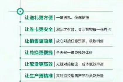 企业可实现:1.实物转化卡券模式销售,不改变原有的销售渠道,吧目前现在的不同价格的礼盒做成不同价格的礼品卡进行销售提前回笼资金:预售券卡、钱款立即到账、无需立即配套实物提前掌握市场