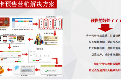 实物转化卡券模式销售,不改变原有的销售渠道,把目前现在的不同价格的礼盒 做成不同价格的礼品卡 进行销售提前回笼资金:预售券卡、钱款立即到账、无需立即配套实物提前